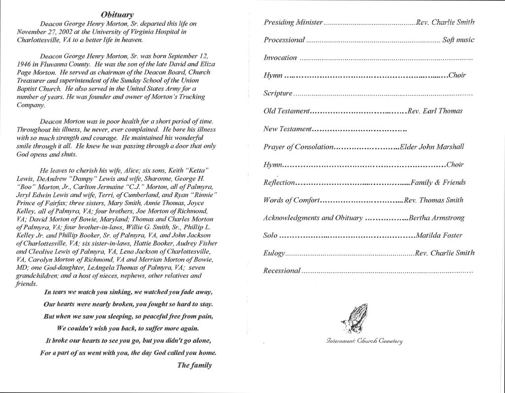 George H. Morton, Sr. b. September 12, 1946 – d. April 27, 2002 Submit your memories here Return to home page Return to home page Share this: Click to share on X (Opens in new window) X Click to share on Facebook (Opens in new window) Facebook Like Loading...