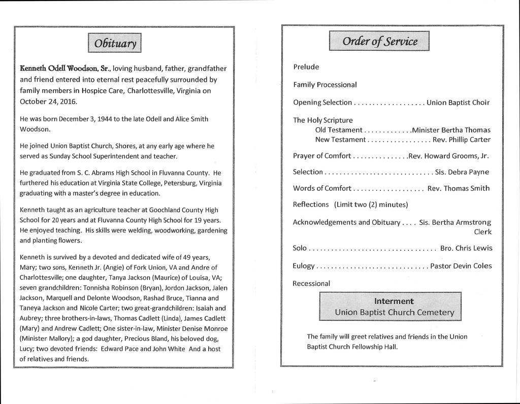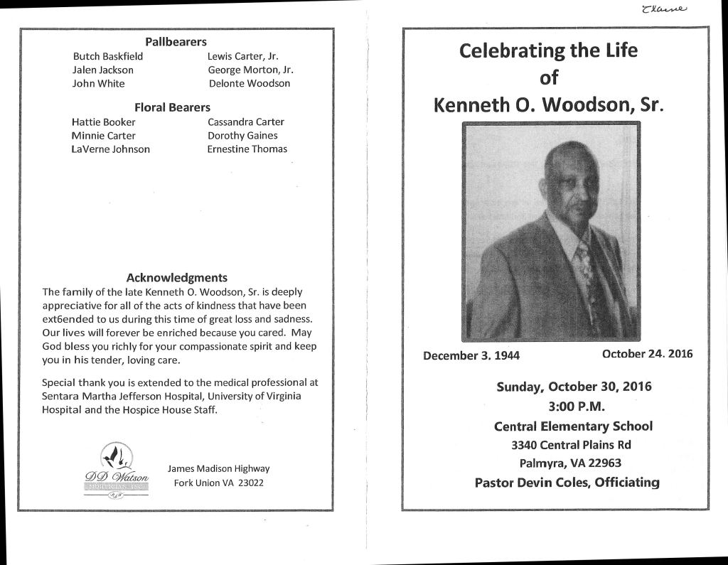 Kenneth O. Woodson, Sr. b. December 3, 1944 – d. October 24, 2016 Submit your memories here Return to home page Return to home page Share this: Share on X (Opens in new window) X Share on Facebook (Opens in new window) Facebook Like Loading...
