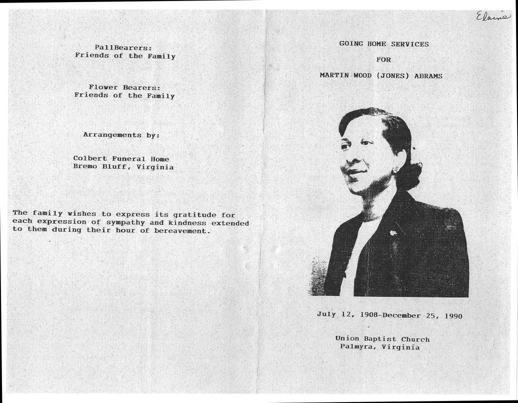 Martin Wood (Jones) Abrams b. July 12, 1908 – d. December 25, 1990 Submit your memories here Return to home page Return to home page Share this: Click to share on X (Opens in new window) X Click to share on Facebook (Opens in new window) Facebook Like Loading...