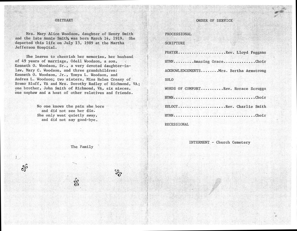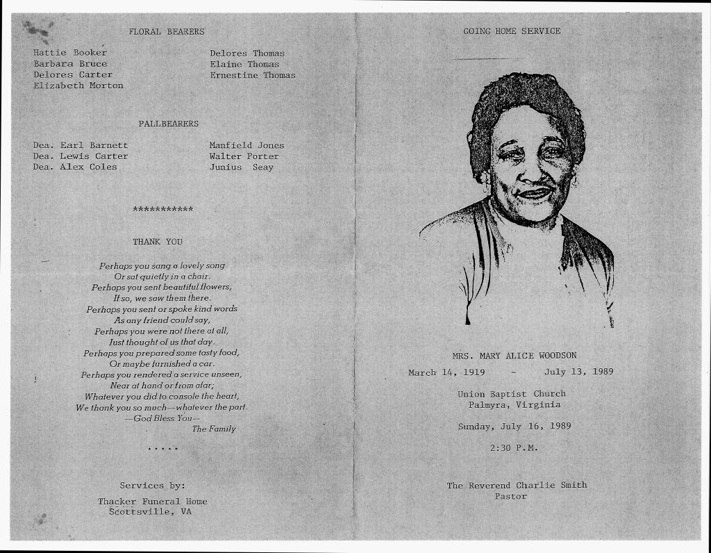 Mary Alice Woodson b. March 14, 1919 – d. July 13, 1989 Submit your memories here Return to home page Return to home page Share this: Click to share on X (Opens in new window) X Click to share on Facebook (Opens in new window) Facebook Like Loading...