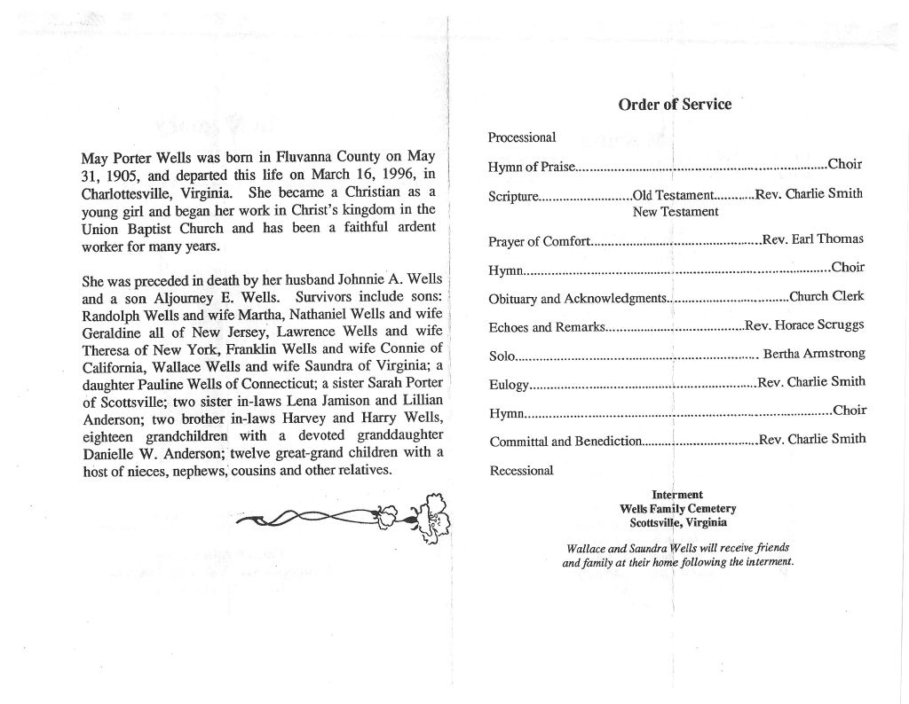 May Porter Wells b. May 31, 1905 – d. March 16, 1996 Interred in Wells Family Cemetery Scottsville, VA. Submit your memories here Return to home page Return to home page Share this: Click to share on X (Opens in new window) X Click to share on Facebook (Opens in new window) Facebook Like Loading...