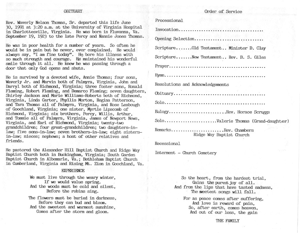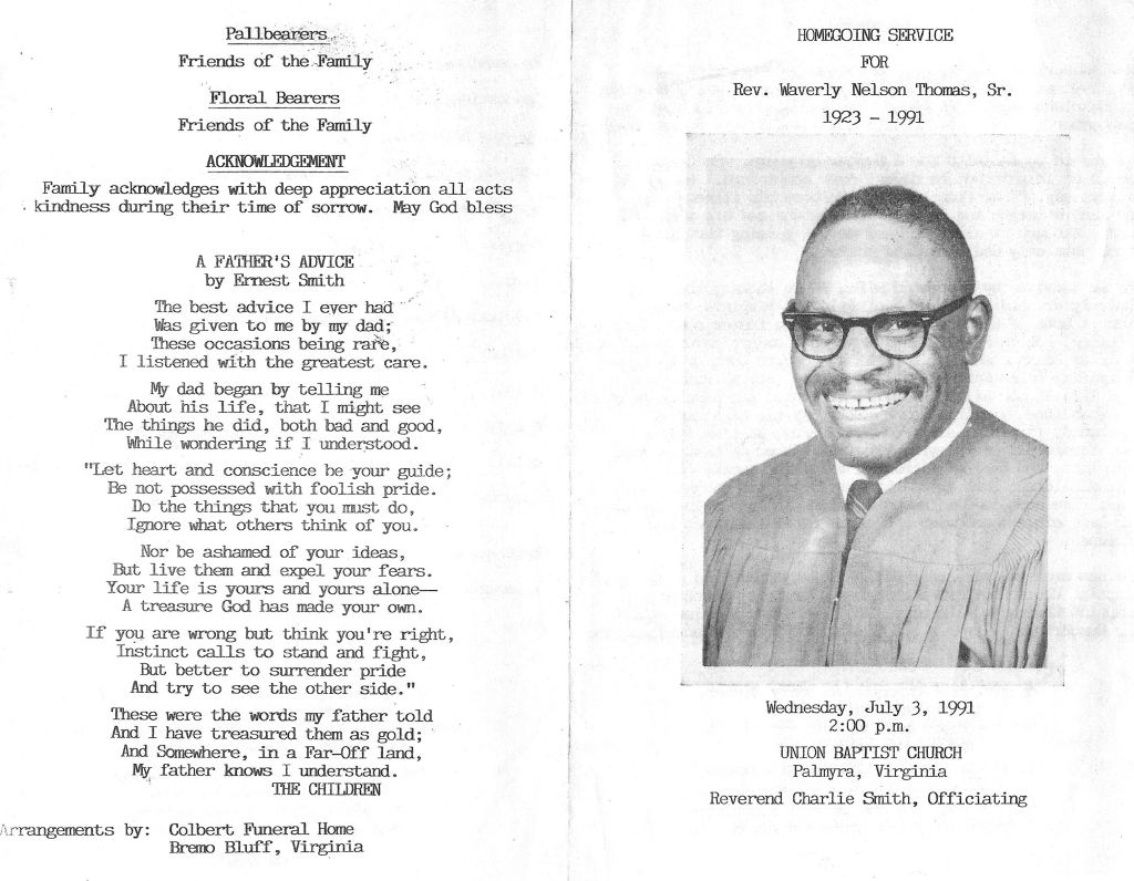 Rev. Waverly Nelson Thomas, Sr. b. September 19, 1923 – d. June 30, 1991 Submit your memories here Return to home page Return to home page Share this: Click to share on X (Opens in new window) X Click to share on Facebook (Opens in new window) Facebook Like Loading...